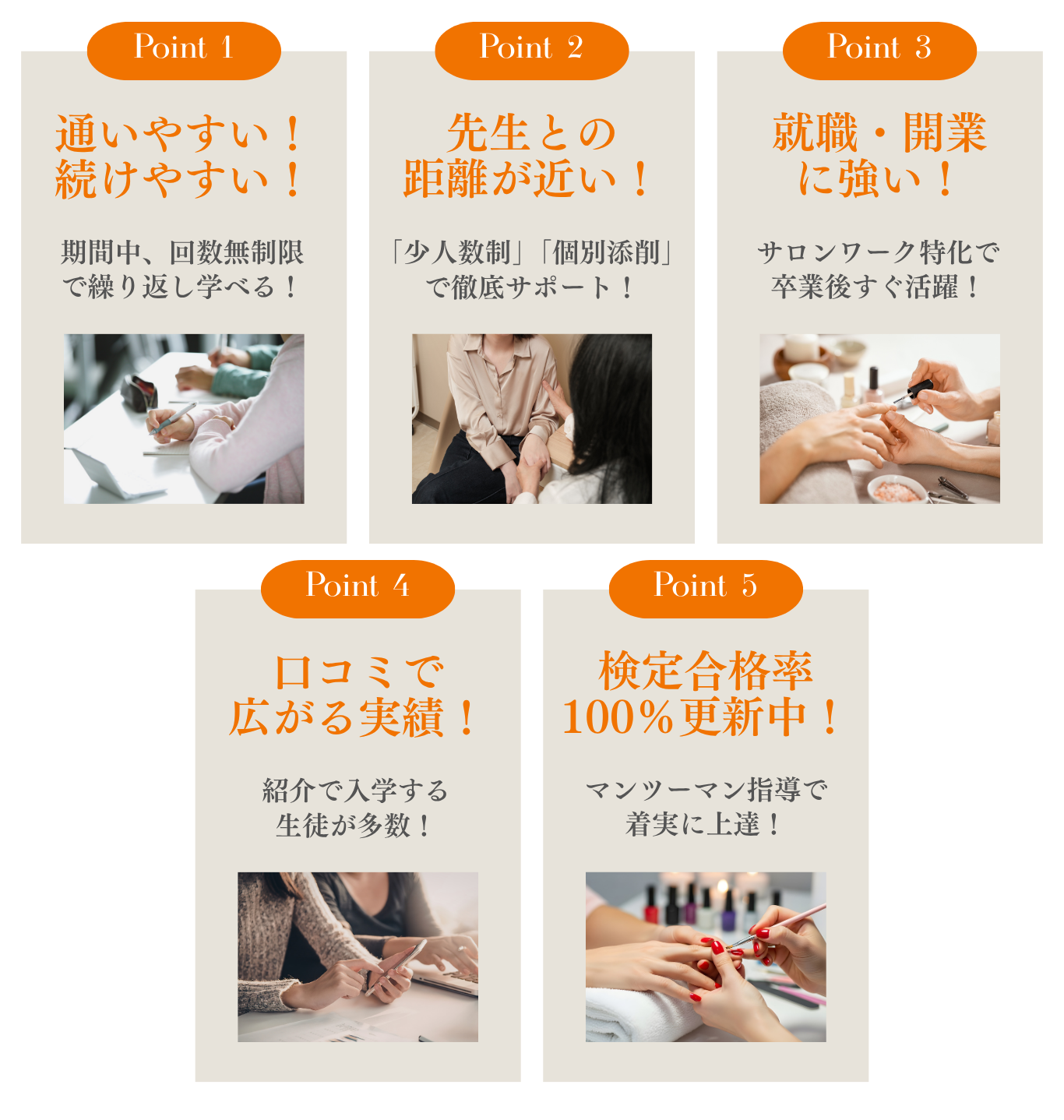 | 実際の現場で使える技術を多く学べるから | 開業・就職実績 | 教材・コストがはっきりしていたから | 通いやすそう | その他 |